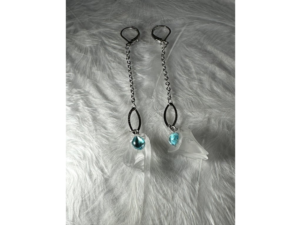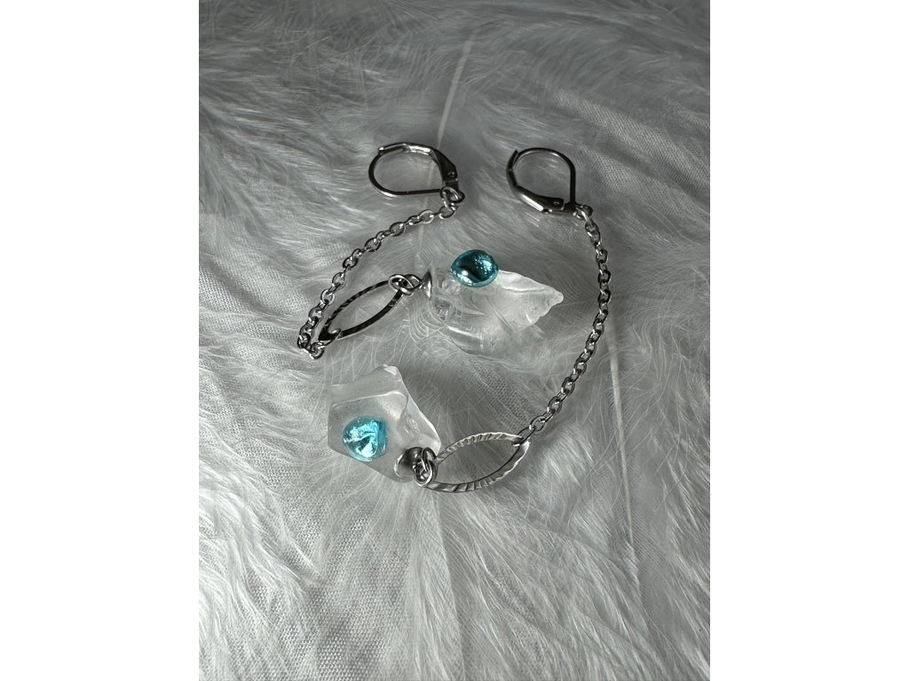 Délka náušnic je 7 cm. Sklo je dozdobeno skleněnou kapkou, která v sobě obsahuje stříbro a tím háže krásné, jemné odlesky.