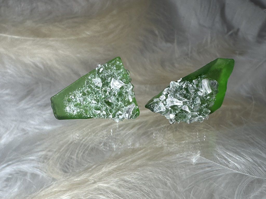 Každý střípek mi projde několikrát rukama, dobrušuji, kombinuji a pískuji jej. Tím vzniká nádherný, jemný, matný efekt, ale je zároveň zachována průzračnost a světlo krásně sklem prostupuje v různých úhlech a tak se náušnice budou měnit po celý den.