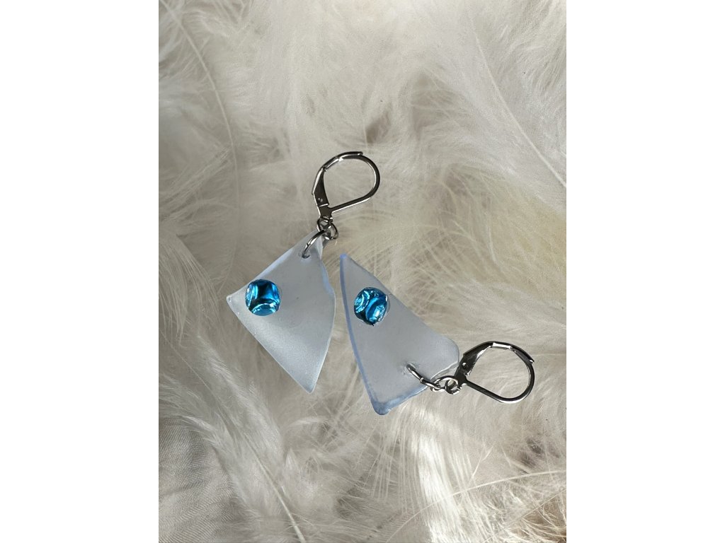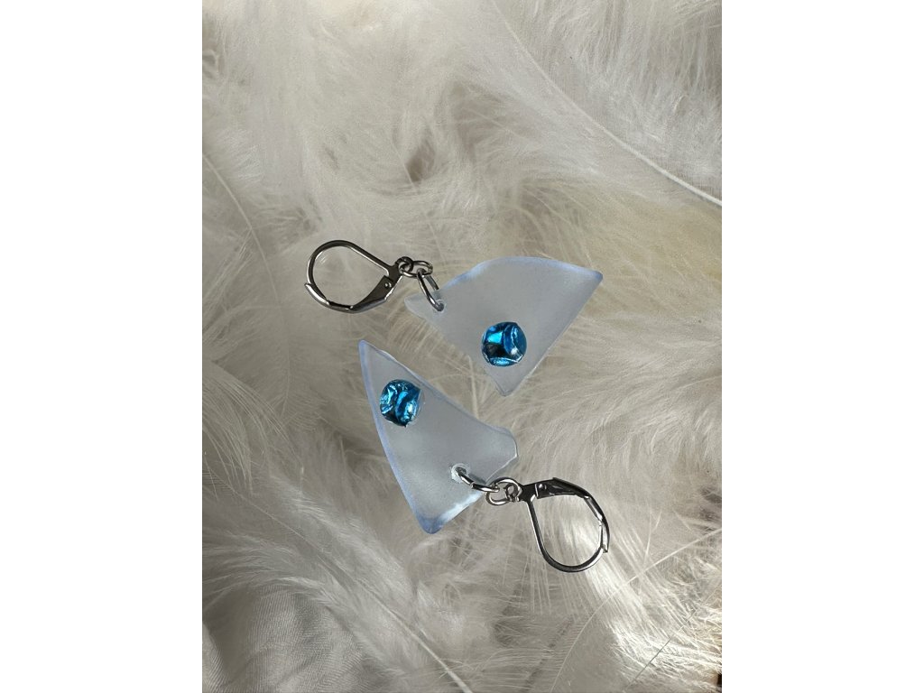 Každý střípek mi projde několikrát rukama, dobrušuji, kombinuji a pískuji jej. Tím vzniká nádherný, jemný, matný efekt, ale je zároveň zachována průzračnost a světlo krásně sklem prostupuje v různých úhlech a tak se náušnice budou měnit po celý den.