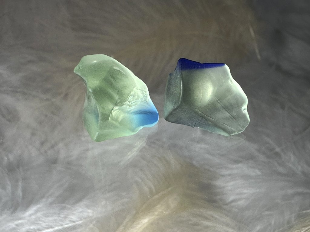 Každý střípek mi projde několikrát rukama, dobrušuji, kombinuji a pískuji jej. Tím vzniká nádherný, jemný, matný efekt, ale je zároveň zachována průzračnost a světlo krásně sklem prostupuje v různých úhlech a tak se náušnice budou měnit po celý den.