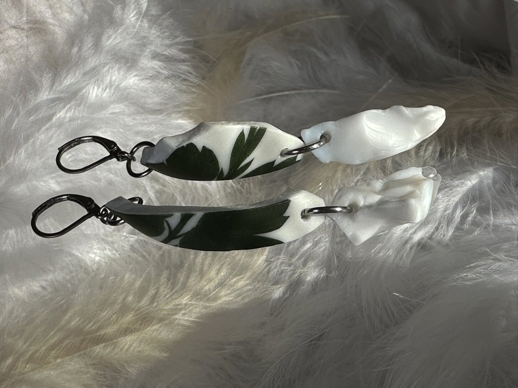 Sklo je doplněno nalezeným porcelánem. Celé náušnice mají délku 6 cm, zapínání je uzavíratelné.