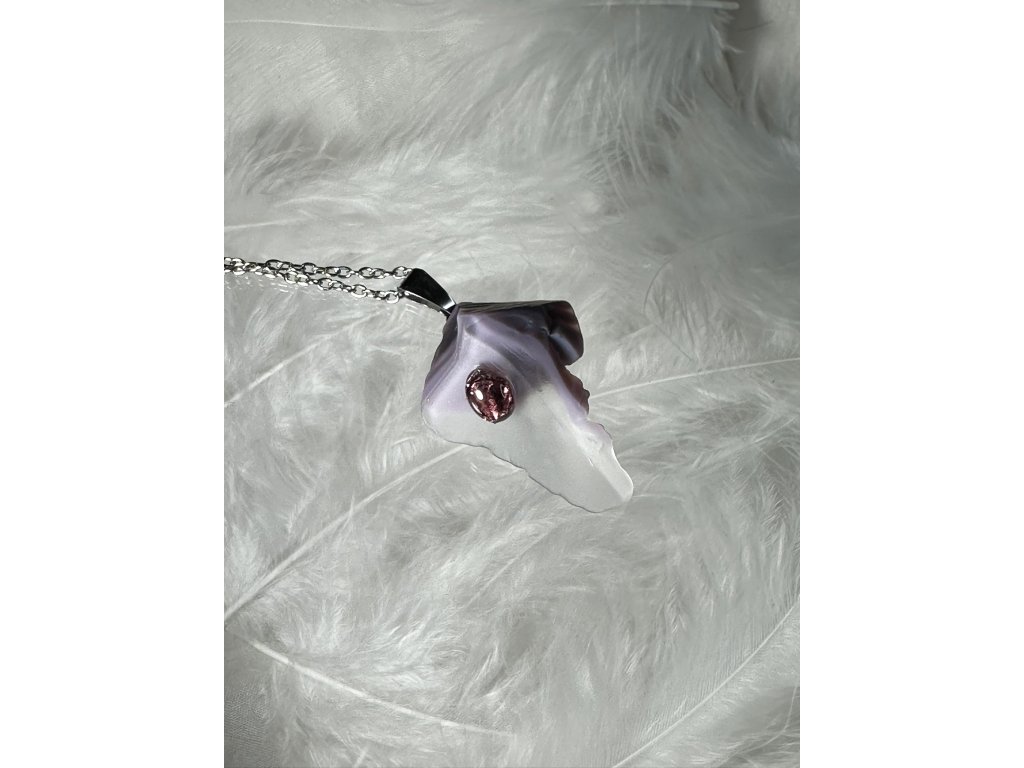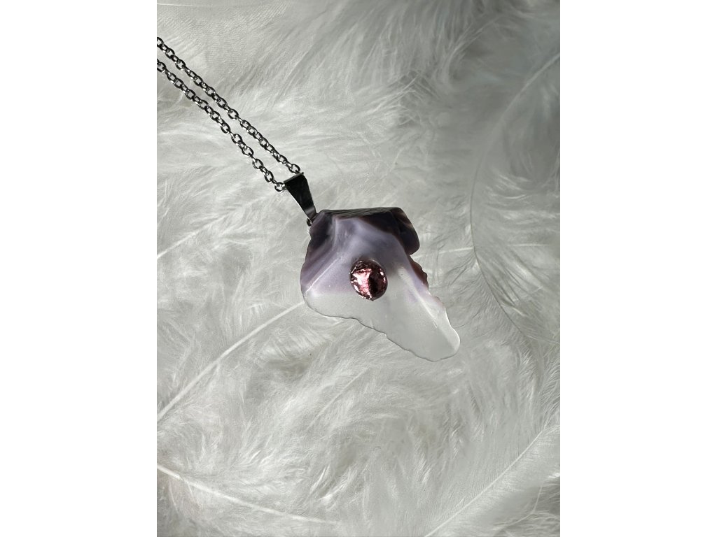 Zavěšeno na řetízku z kvalitní, antialergenní nerez oceli o délce 55 cm.