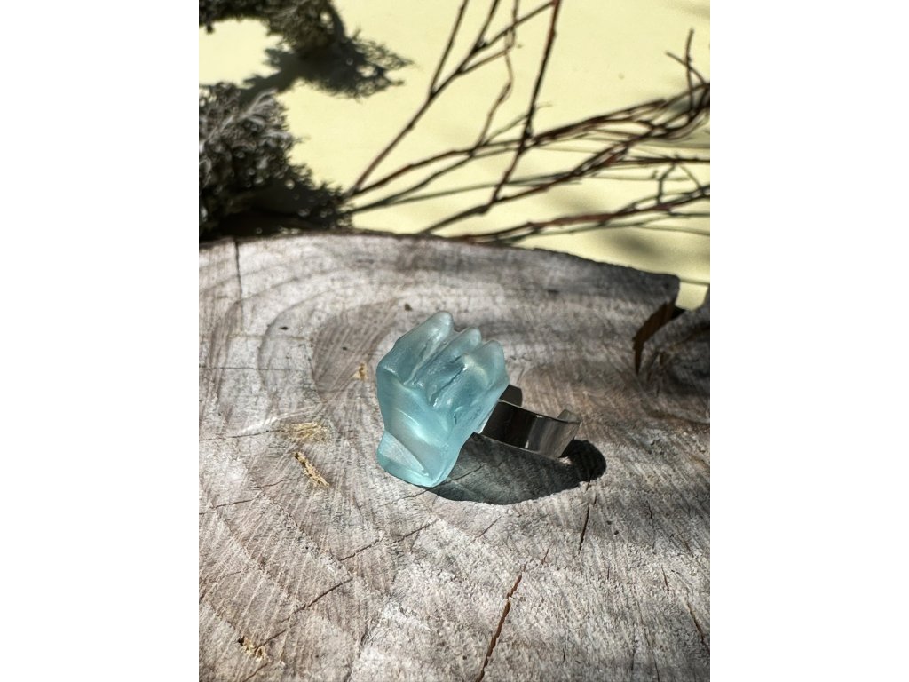 Každý střípek mi projde několikrát rukama, dobrušuji, kombinuji a pískuji jej. Tím vzniká nádherný, jemný, matný efekt, ale je zároveň zachována průzračnost a světlo krásně sklem prostupuje v různých úhlech a tak se prsten bude měnit po celý den.