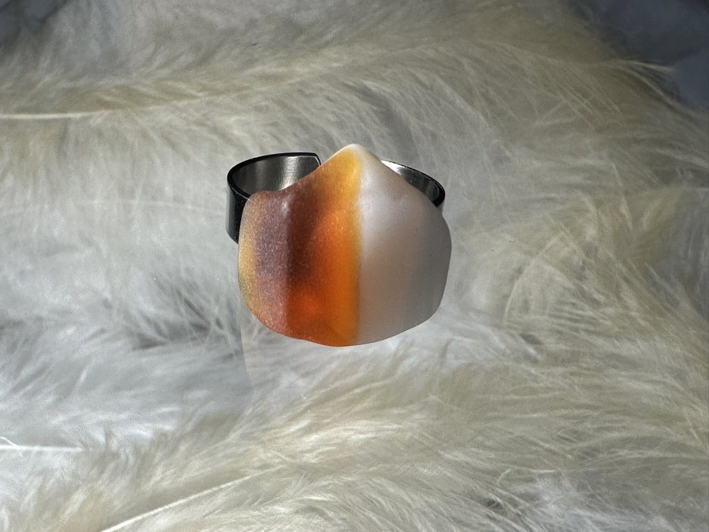 Každý střípek mi projde několikrát rukama, dobrušuji, kombinuji a pískuji jej. Tím vzniká nádherný, jemný, matný efekt, ale je zároveň zachována průzračnost a světlo krásně sklem prostupuje v různých úhlech a tak se prsten bude měnit po celý den.