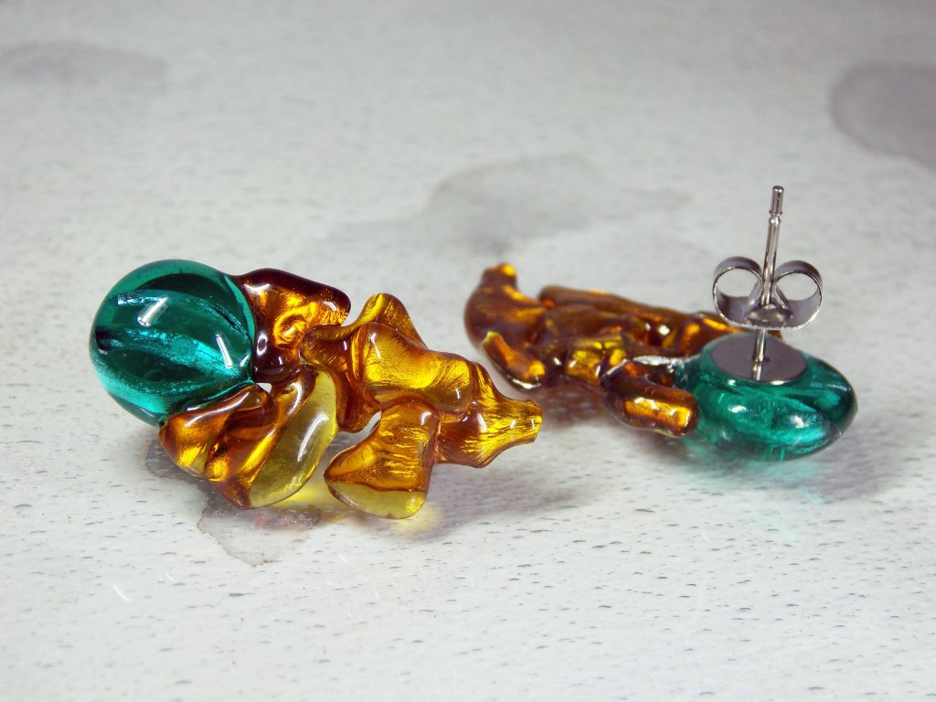 Nevšední náušnice ze střepů medového skla, které v sobě obsahuje kousky stříbra a díky tomu jasně září. Vše spékám ve sklářské peci a ponechávám nepravidelnosti střepů. Díky zajímavému tvaru a zlatu uvnitř skla, jsou náušnice ojedinělou a nepřehlédnutelnou ozdobou. Zapínání je puzetové z antialergenní nerez ocele. U těchto náušnic oceníte jejich lehkost a moderní design.